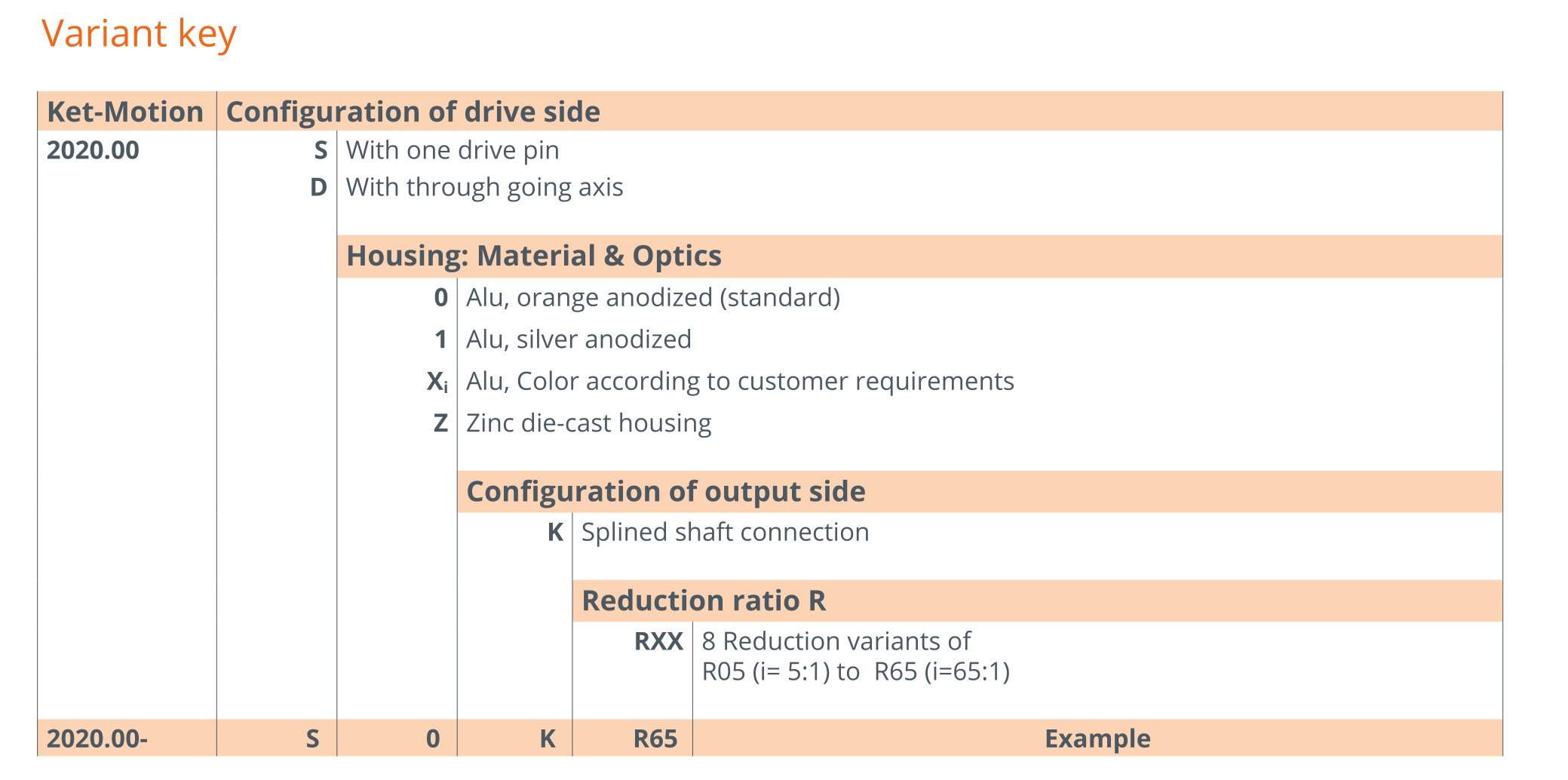- The Worm gear Ket-Motion 2020 D is available in different variants. The variants are composed in accordance with the ordering code shown on the data sheet.